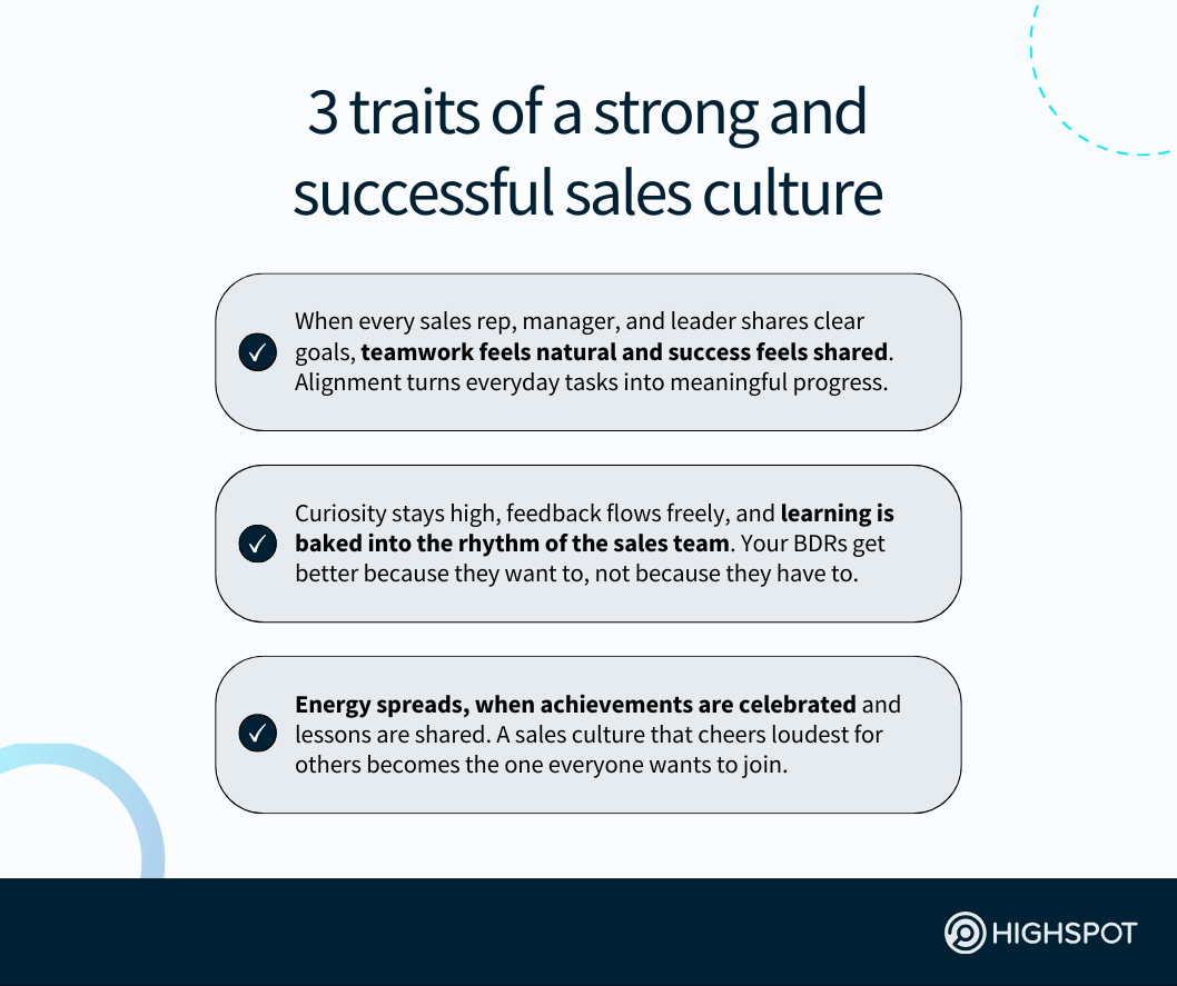 - A high-performing sales team culture begins with leadership that models shared values, fosters healthy competition, and promotes trust to keep the entire team motivated and aligned.