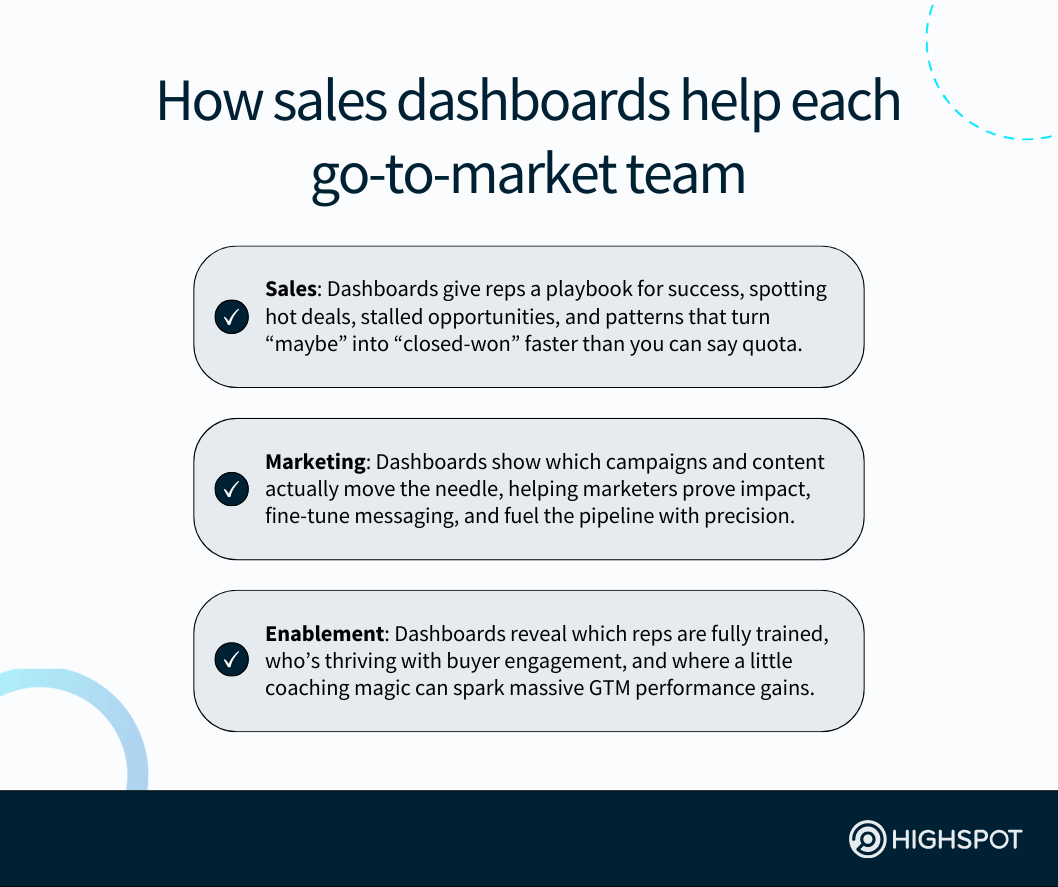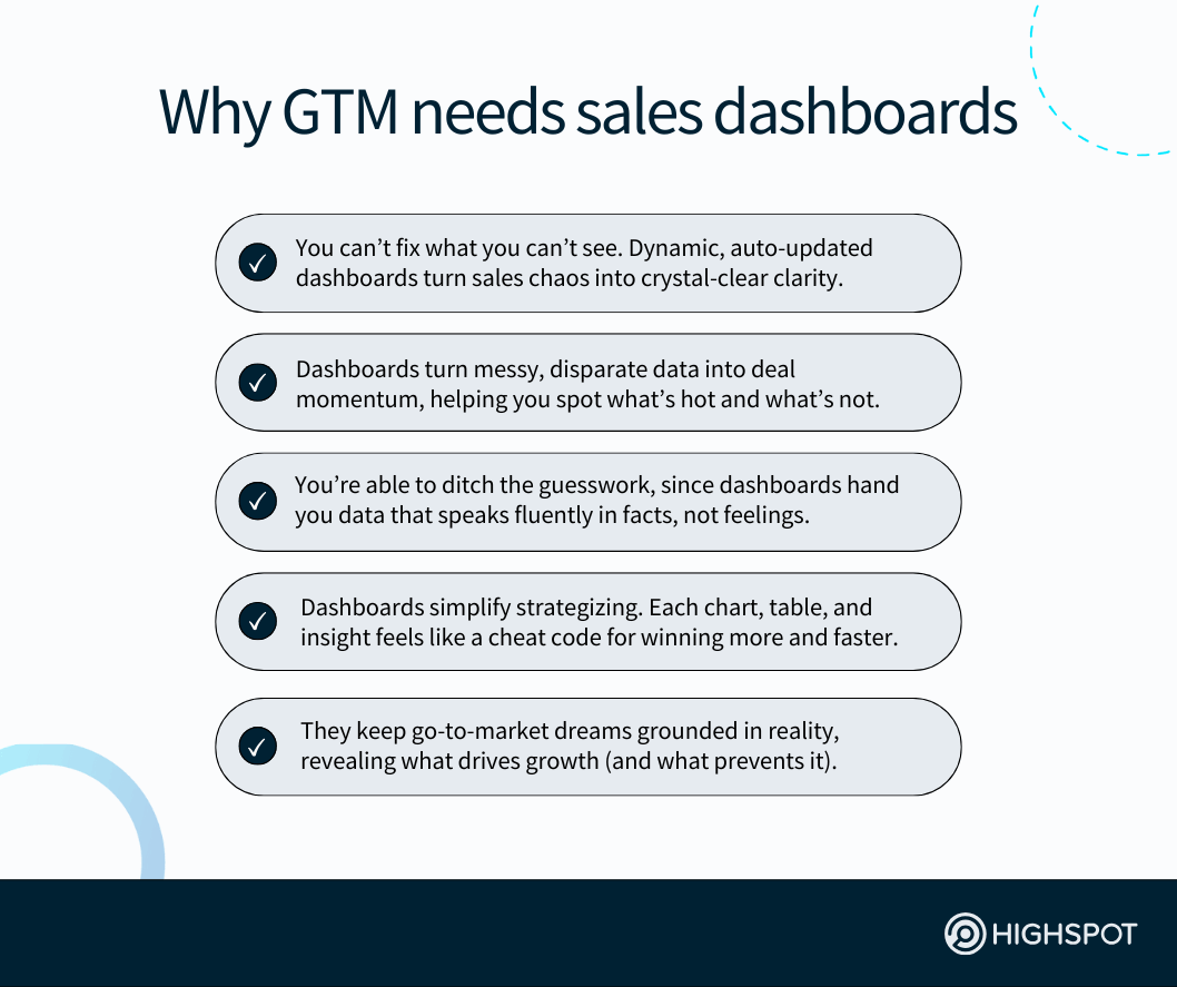 - Great sales dashboards give go-to-market (GTM) leaders the power to see what’s really driving growth. When data turns into direction, you’re not just watching numbers. You’re also steering the ship straight toward smarter, faster, and more predictable wins.