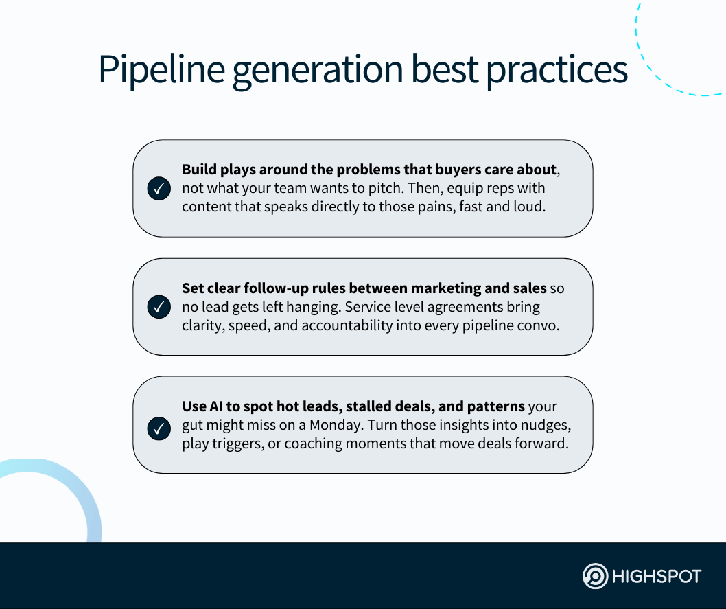 - The best pipeline generation strategies align teams around SLAs, high-yield personas, and sales plays that meet buyers where they are. When executed well, they drive higher conversions and lead to savvier sales forecasting and better revenue outcomes for your business.