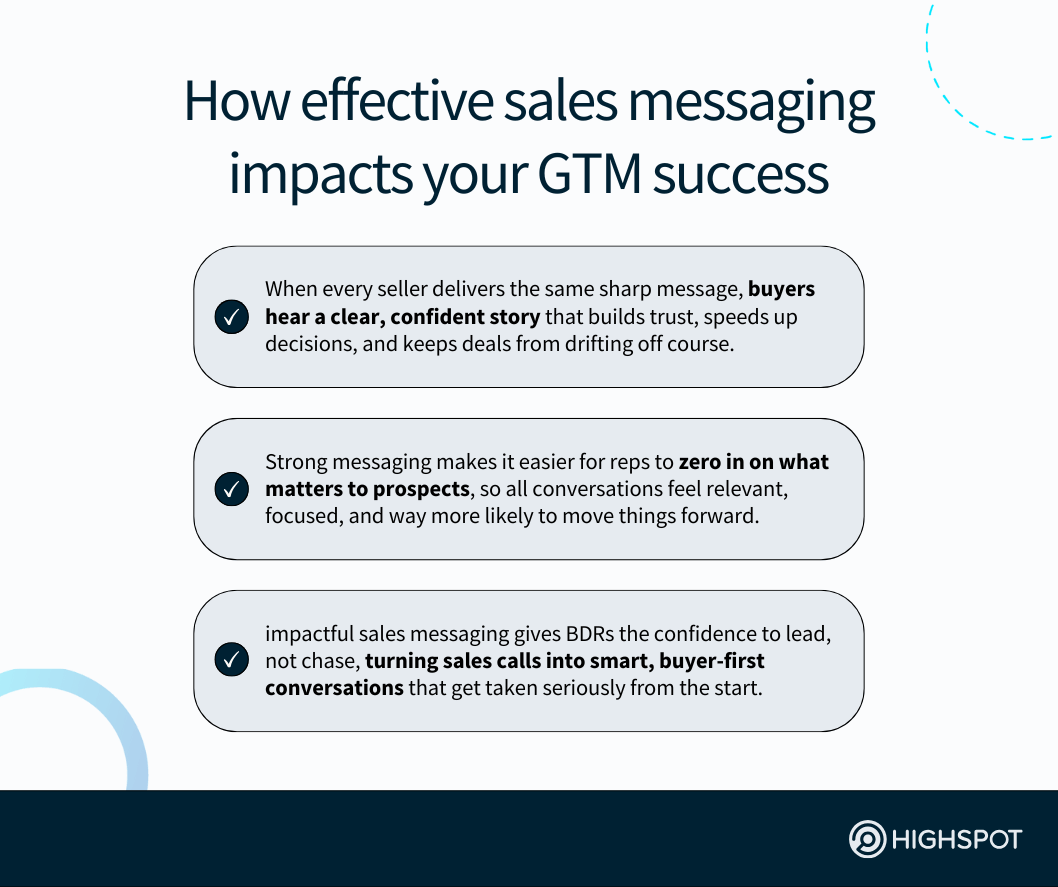- Scaling and modifying outreach: A strong sales messaging framework allows teams to refine and reuse what works and transform one-off wins into repeatable success.