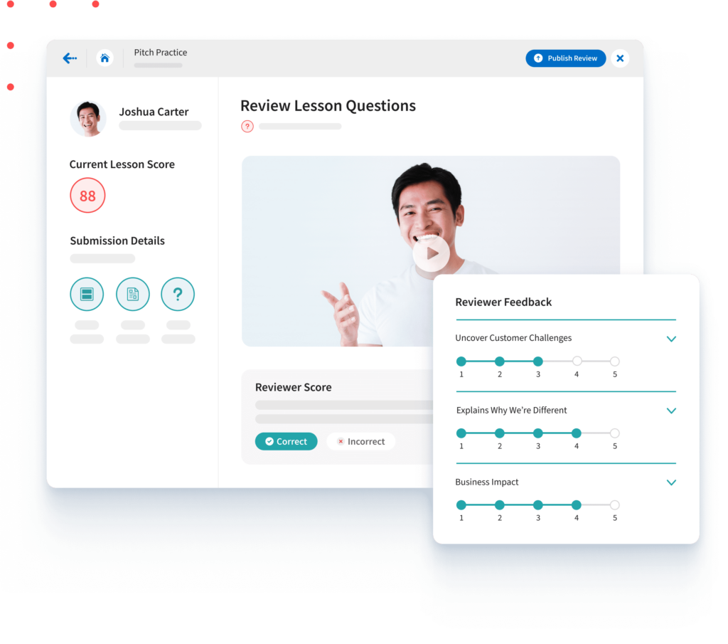 Absolutely. The platform evaluates performance across practice, training, peer or manager reviews, and actual buyer meetings to generate comprehensive insights and skills scores.