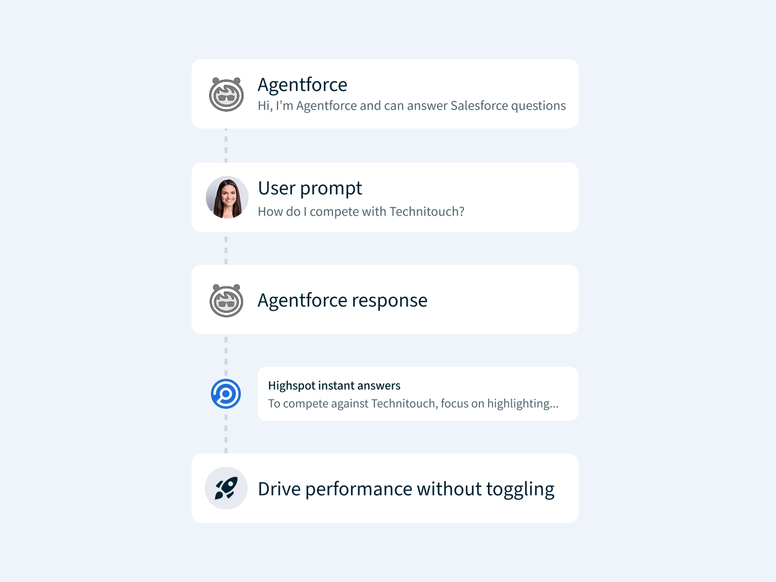 Blend Highspot content, analytics, and AI with Salesforce Agentforce in a single, unified experience. Get conversational insights to power sales execution, surface Highspot training for meeting prep, and take action to win deals.