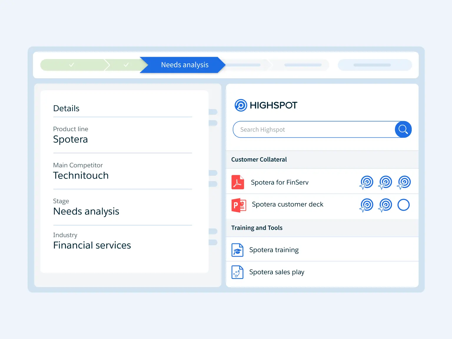 Deliver content, training, and AI insights directly in CRM to increase buyer engagement and sales productivity. Highspot auto-relates buyer engagement to Salesforce records–no manual input required.