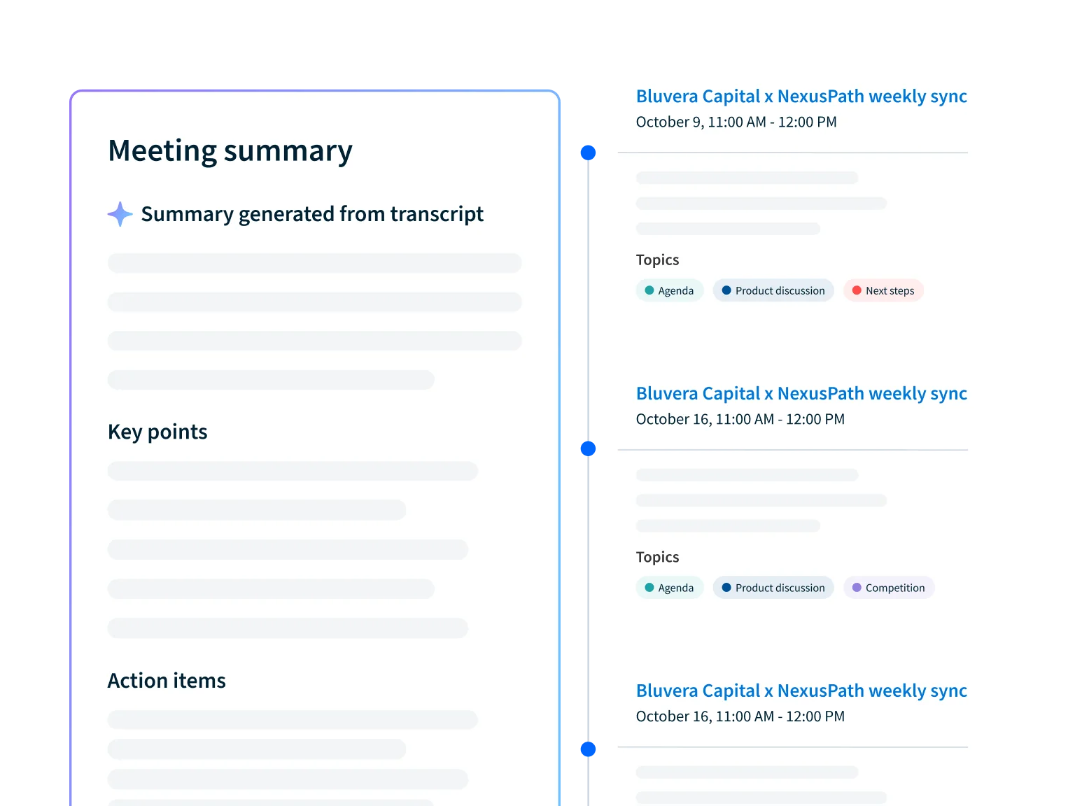 View a timeline of every deal. Click into meetings to explore summaries, key points, objections, and next steps, all surfaced by AI so you never miss a moment that matters.