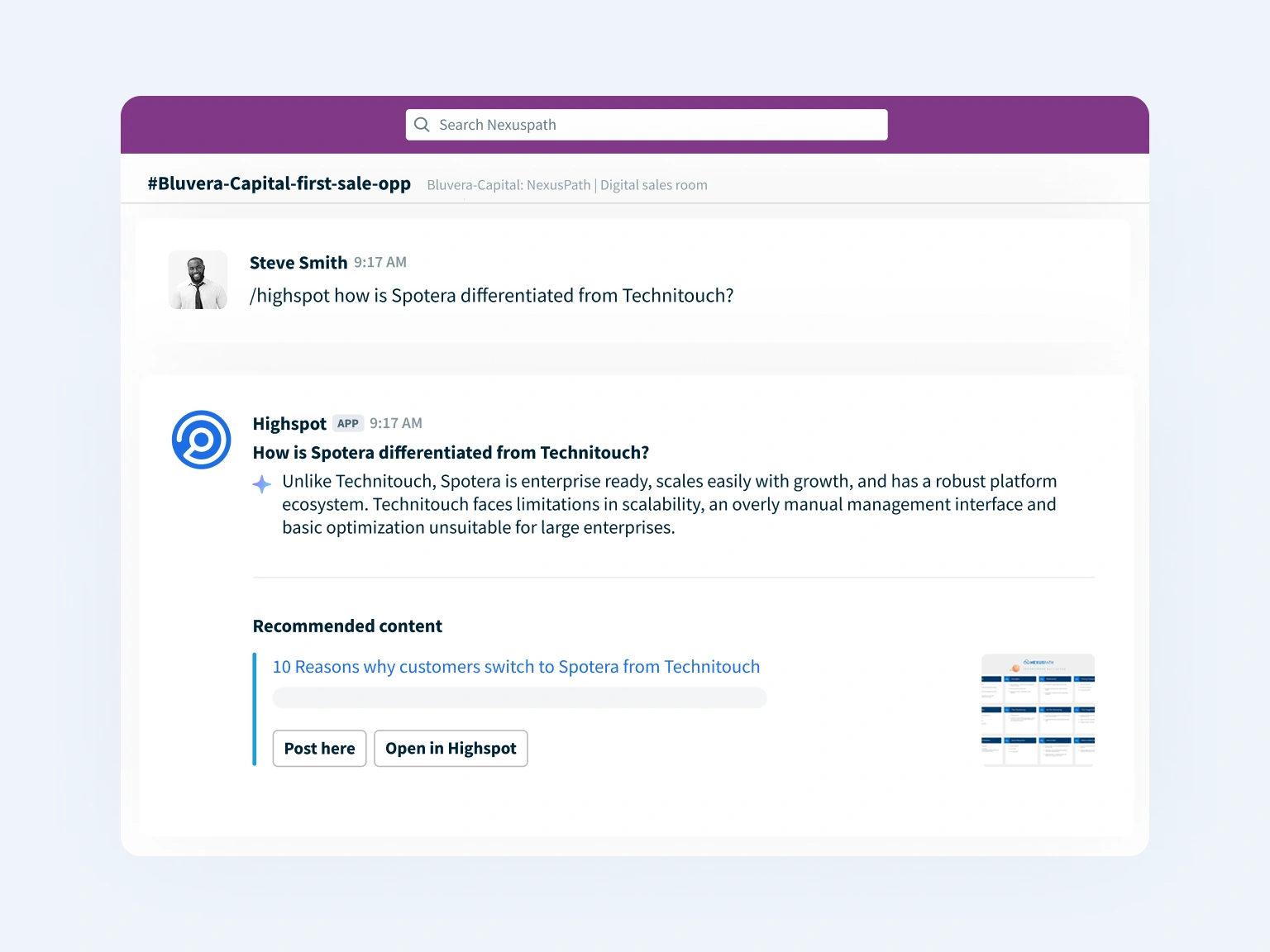 The Highspot for Slack AI integration embeds Highspot AI directly into conversations, giving reps instant answers based on all available Highspot content and analytics. By surfacing best practices, top-performing content, and recommended plays in real time, sellers can move deals forward without leaving Slack.