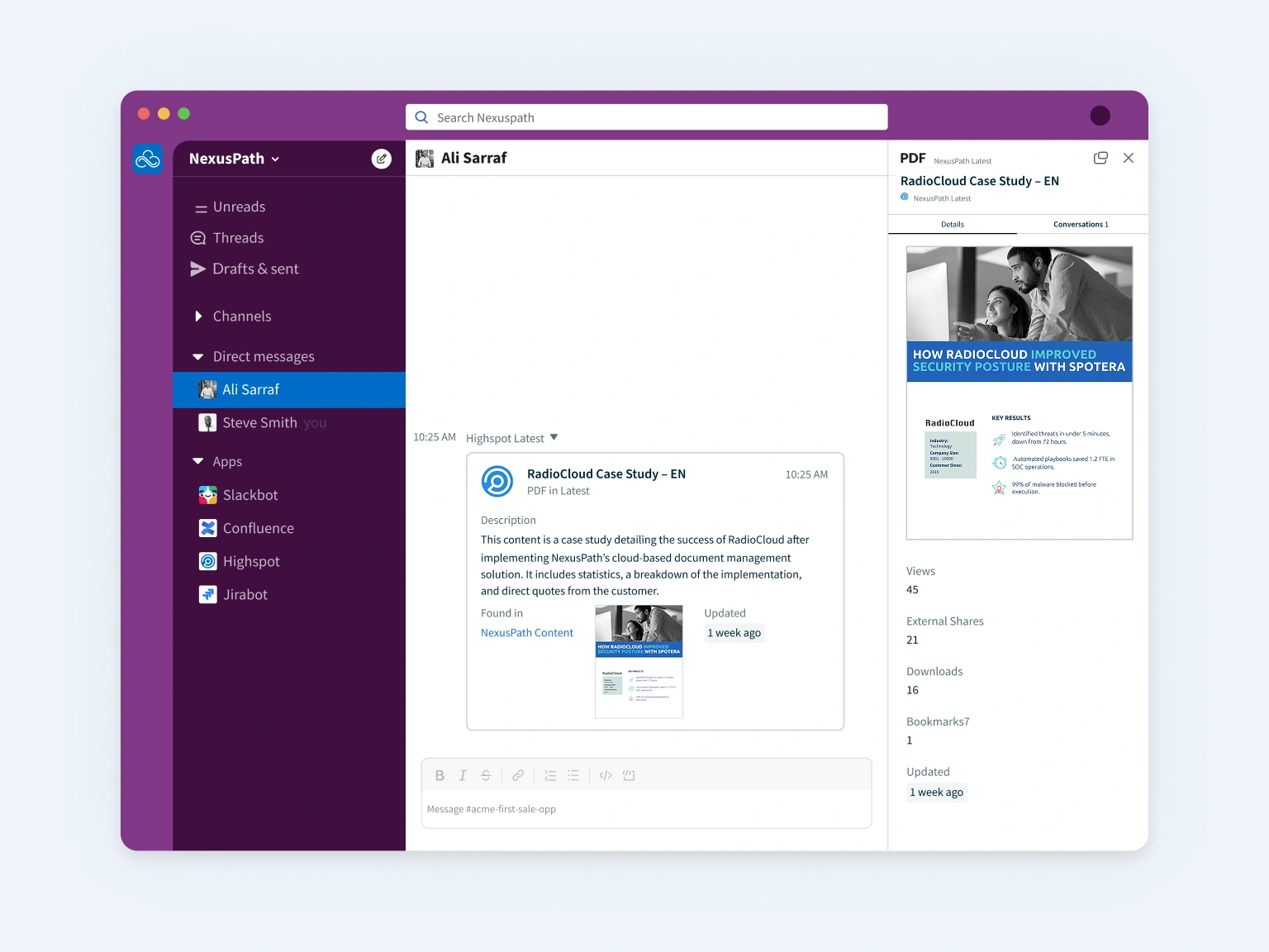 Highspot for Slack provides a clean, consistent user experience for all Highspot objects embedded in Slack, offering users enhanced search capabilities and rich content details to work faster and smarter.