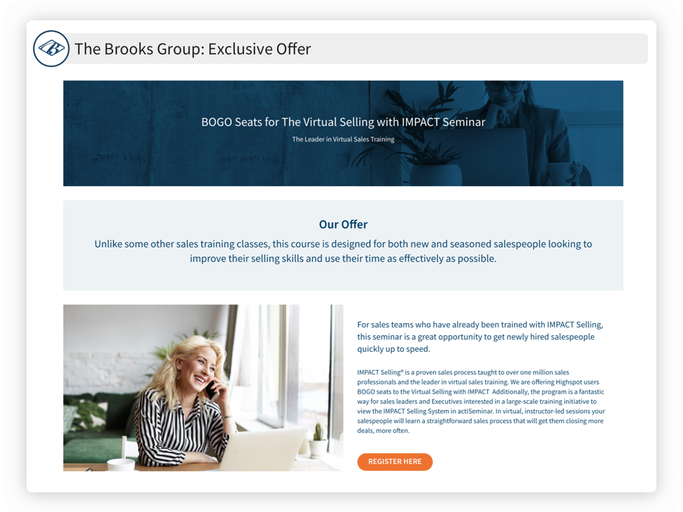 IMPACT Selling® is a proven sales process taught to over one million sales professionals and the leader in virtual sales training. We are offering Highspot users BOGO seats to the Virtual Selling with IMPACT Seminar. In virtual, instructor-led sessions your salespeople will learn a straightforward sales process that will get them closing more deals, more often.