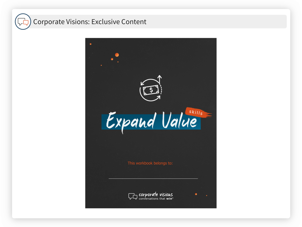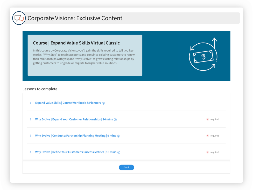 In Expand Value Skills, you will have two delivery modalities available–the first (one course) being self-paced, and the second (two courses comprised of materials in the first course) that contain a fluency challenge that users submit at the completion of their e-learning.