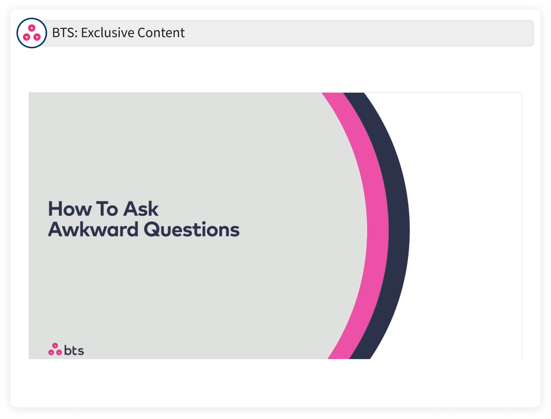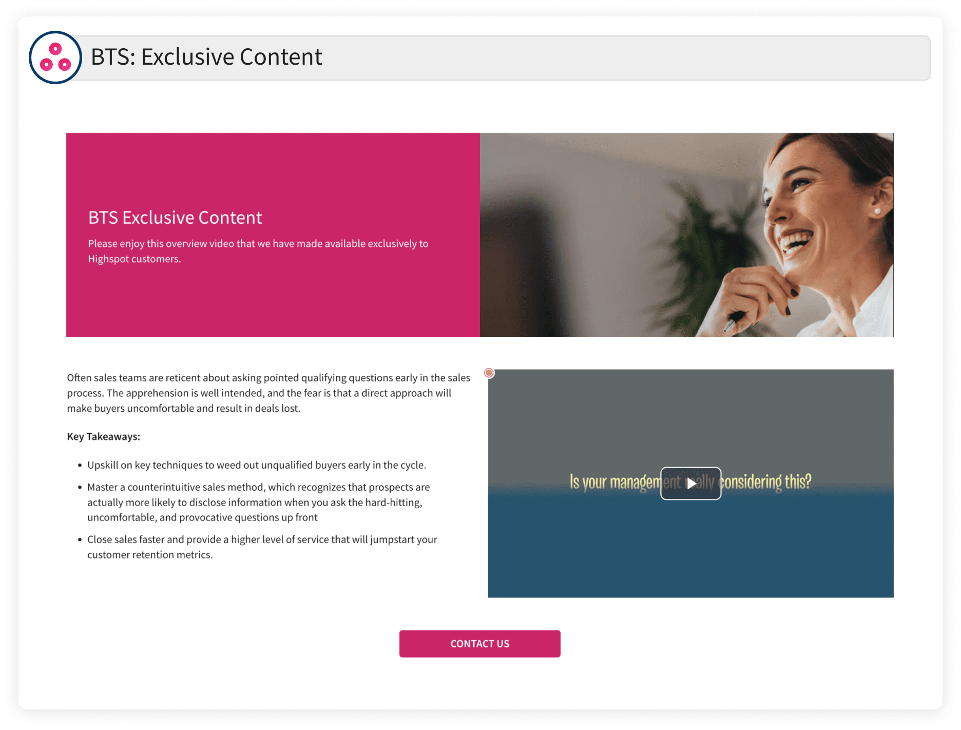Often sales teams are reticent about asking pointed qualifying questions early in the sales process. The apprehension is understandable, and the fear is that a direct approach will make buyers uncomfortable and result in deals lost. This offer is made at the full digression of BTS Group AB. The video content is property of BTS Group AB. Reproduction or distribution outside of this platform not permitted.