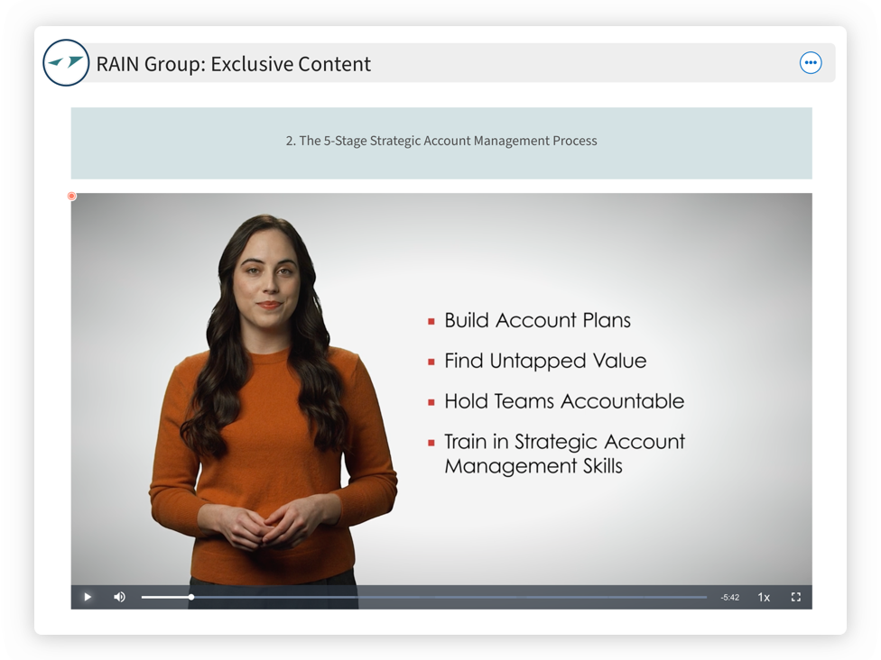 Growing existing accounts is a top priority for many sales organizations. Discover a process that will help you strengthen and deepen your relationship with clients, develop a plan to get there, and implement strategies to uncover significant growth opportunities within your accounts. These resources, including the exclusive RAIN Group Strategic Account Planner (typically available to RAIN Group clients), have been made available to you through our partnership with Highspot.