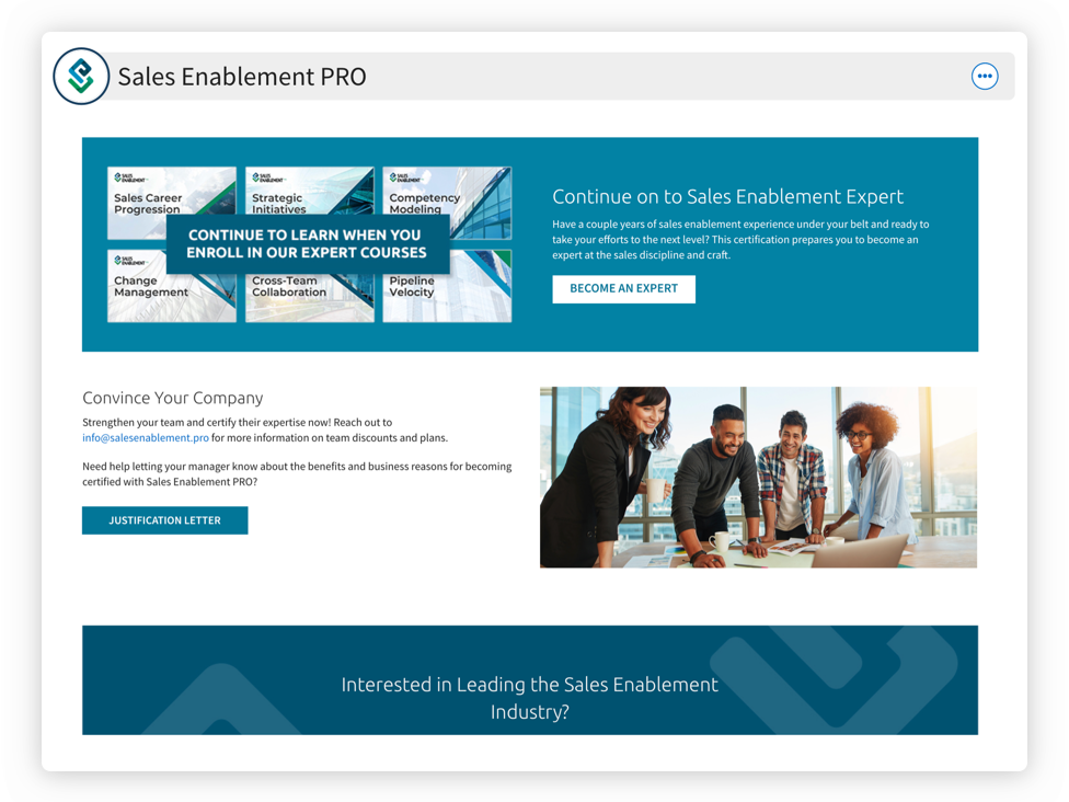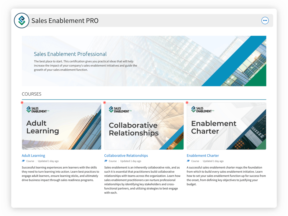 The most successful people in life never stop learning. At Sales Enablement PRO, we aim to deliver sales enablement expertise you can use every day by amplifying the voices of practitioners, thought leaders, and industry luminaries. We’ve built an amazing community of enablement experts who are striving to learn from each other and continue to grow momentum for the enablement market. Grow your sales enablement knowledge and skills with the Sales Enablement PRO Premium Enablement Package. This package will provide industry expertise and thought leadership through articles, podcasts, tools, data-backed reports, and access to our fundamental certification program: Sales Enablement Professional. With six unique courses, you will gain core skills that will provide the foundation for a successful sales enablement function, team, and career.