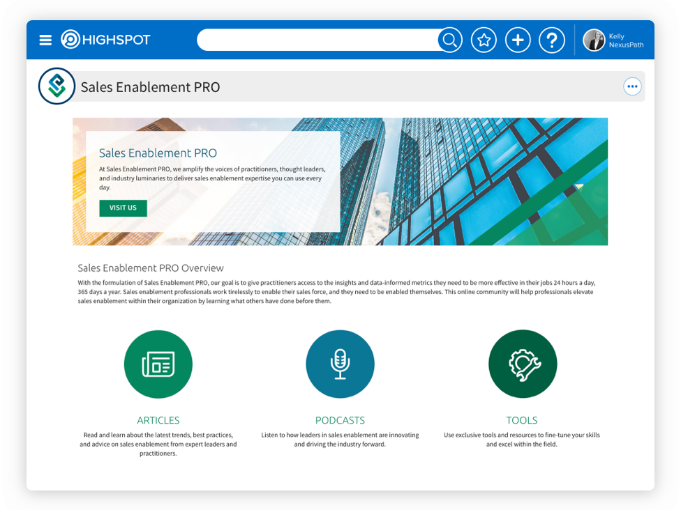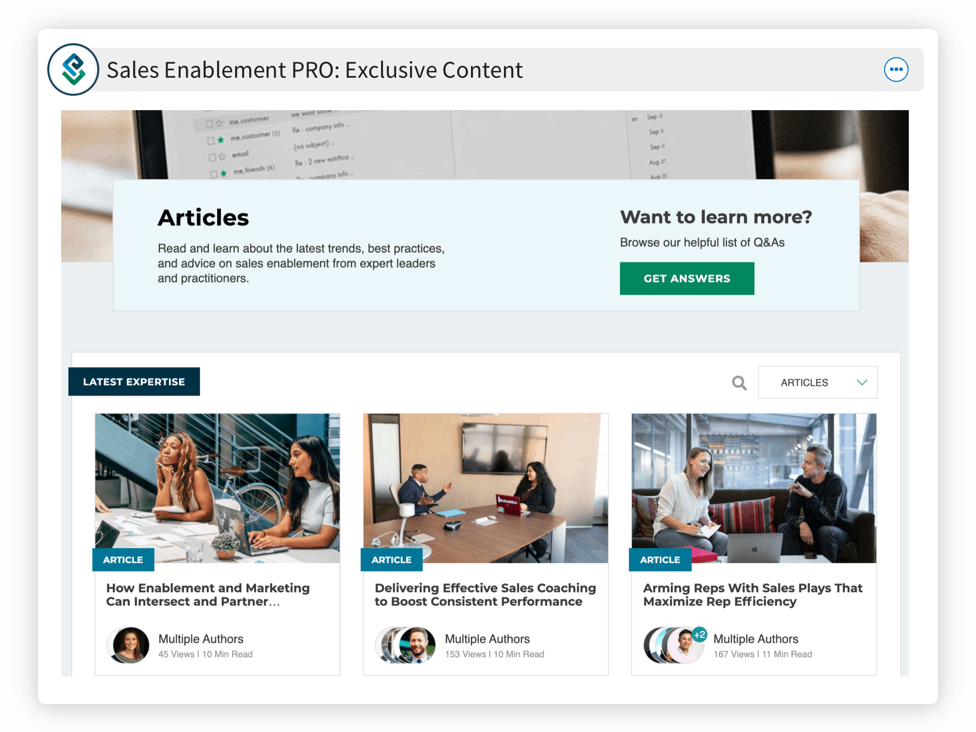 - Daily insights through articles, podcasts, tools, and more thought leadership from sales enablement experts