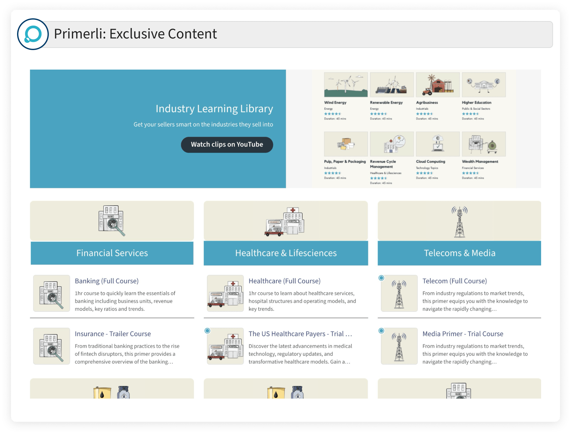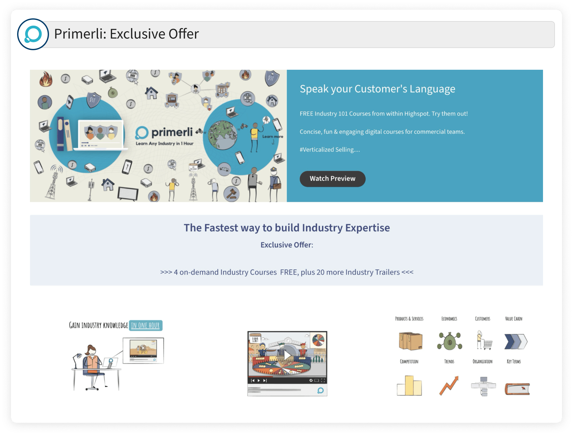 This complimentary offer grants users access to 4 engaging Industry 101 primers covering sectors: Banking, Telecoms, Healthcare, and Oil & Gas. Additionally, they gain entry to 40+ industry introductions and partial access to 20 more industry primers. The video content, with 8-10 short chapters per industry, is under 1 hour each, offering foundational knowledge. This allows users to converse credibly with industry professionals. Fresh and regularly updated, the content seamlessly integrates into various learning pathways, benefiting roles like sales, customer success, and more.