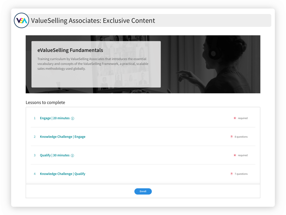 This course introduces you to the ValueSelling Framework® language, concepts, processes, and toolset, organized by typical sales cycle phases: Engage > Qualify > Advance > Close.