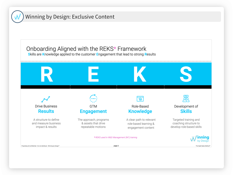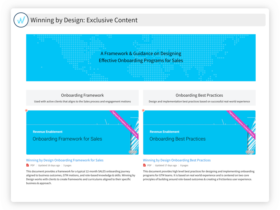This Enablement Package will provide a high-level framework and guidance on designing effective onboarding content & programs for SALES. Specifically, it will outline a typical 12-month sales onboarding journey aligned to business outcomes, GTM motions, and role-based knowledge & skills. Additionally, it will highlight best practices for designing and implementing onboarding programs for go-to-market (GTM) teams. It is based on real-world experience working with clients and is centered on two core principles of building around role-based outcomes & creating a frictionless user experience.