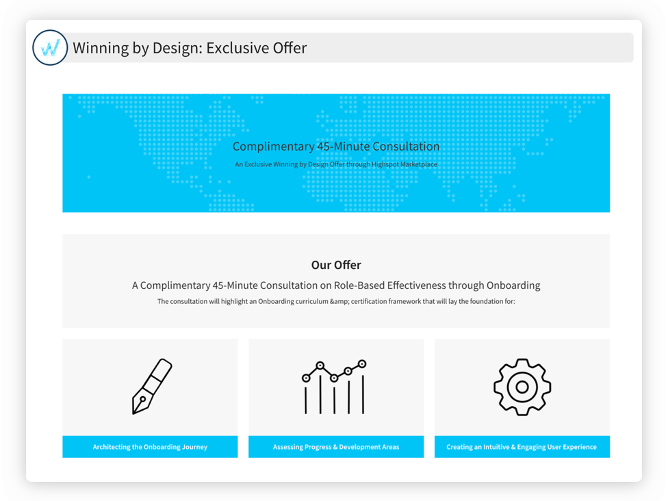 Qualified candidates can take advantage of a complimentary 45-minute consultation on role-based effectiveness through onboarding. Led by Greg Wolfe (Revenue Enablement Architect at Winning by Design), the consultation will highlight an onboarding curriculum & certification framework that will lay the foundation for architecting the onboarding journey, assessing an individual’s progress & development areas & creating an intuitive & engaging user experience.